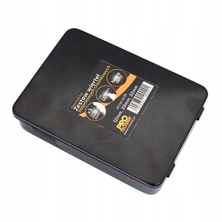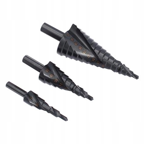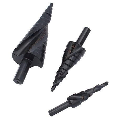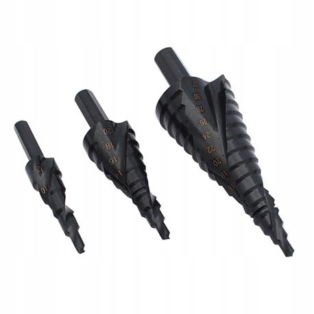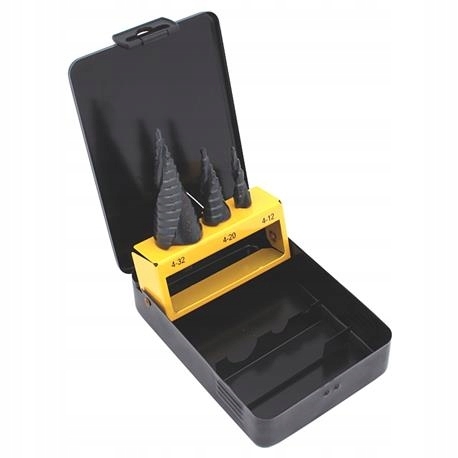 Wiertła stopniowe komplet 3szt: 4-12, 4-20, 4-32 z łamaczem wiórów, ułątwiającym wykonanie otworów. Pakowane w metalową kasetę. Wykonane ze stali szybkotnącej HSS.