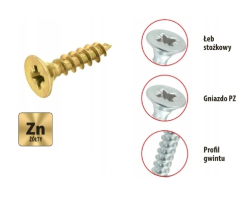 Wkręty wykonane są z metalu hartowanego ocynk żółty, warstwa ocynku jest bardzo gruba, a przez to trwała.