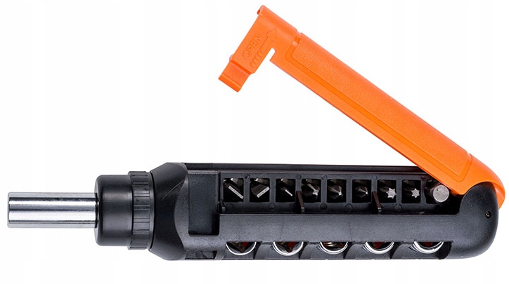 - Rękojeść wykonana z przyjemnego dobrze leżącego w dłoni tworzywa sztucznego, pełniąca jednocześnie funkcję schowka na bity.