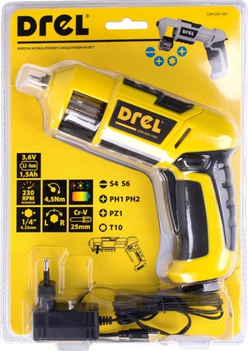 Pakowanie: blister Innowacyjny, opatentowany system zmiany bitów Wkrętak akumulatorowy z magaznynkiem na bity i doświetlającą diodą LED