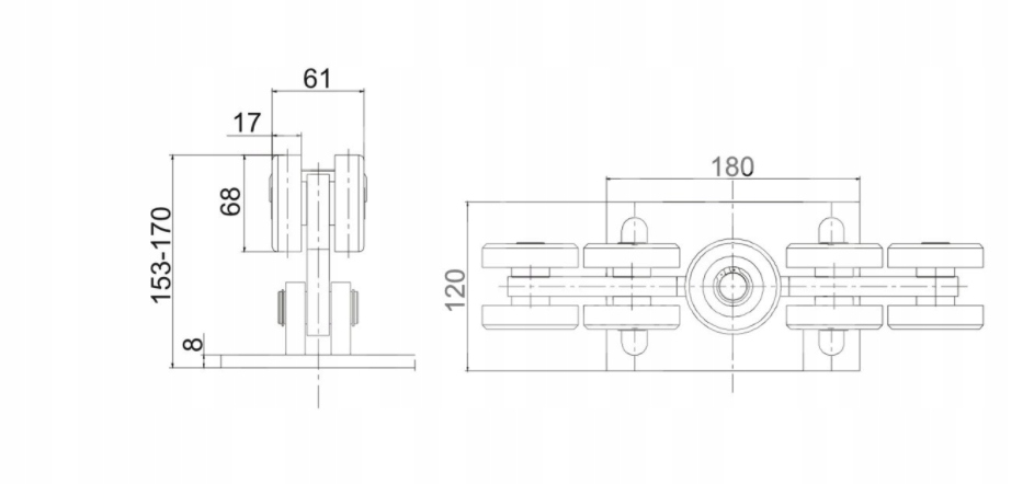 Wózek jezdny do bram podwieszanych, z trzema rolkami (dwie pionowe rolki wykonane są z metalu, a pozioma z tworzywa sztucznego). Wózek jest zamocowany na stałe do podstawy i przeznaczony do szyny 80x80x5 mm. Produkt ocynkowany.