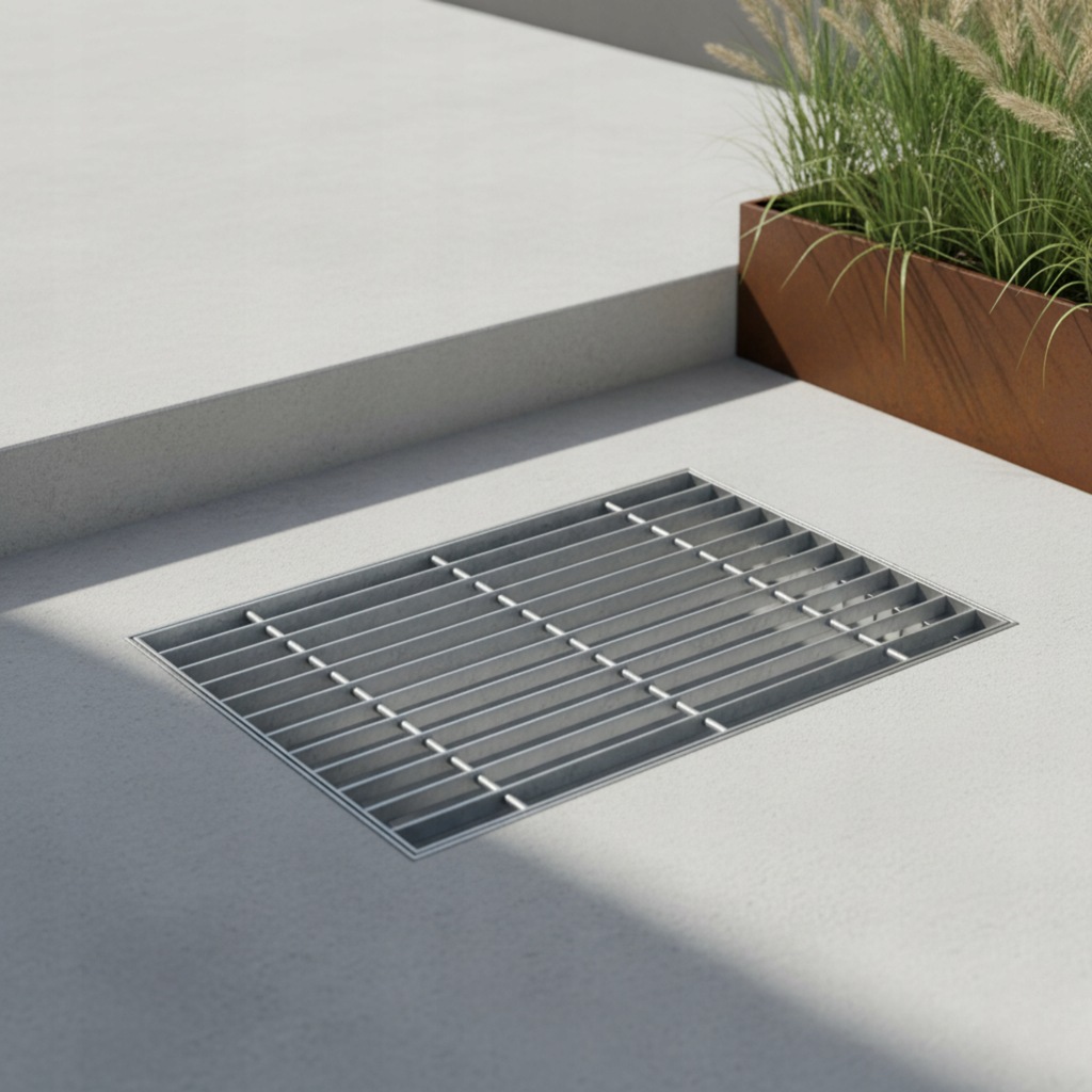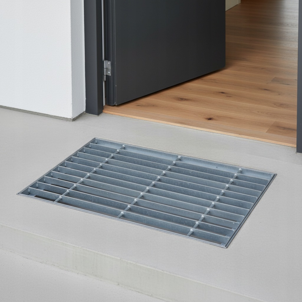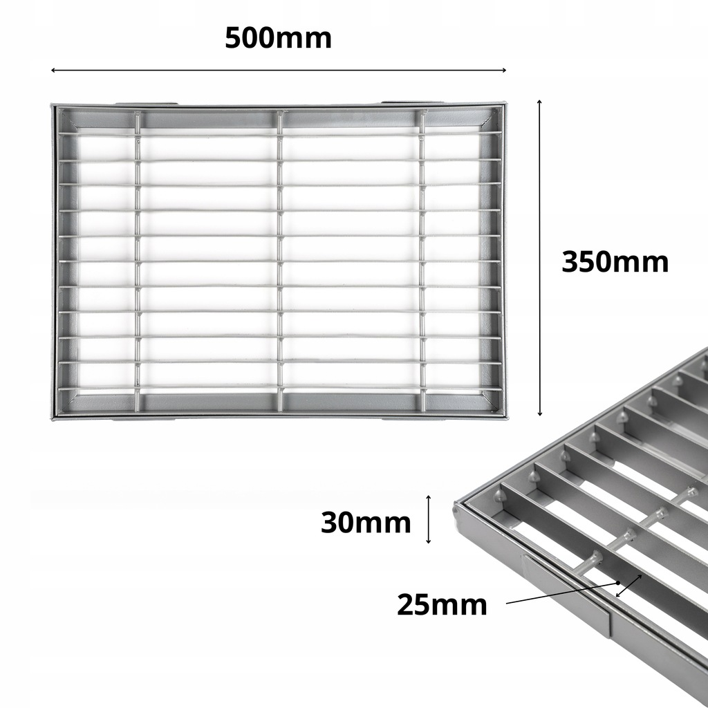 Wycieraczka wykonana z kraty zgrzewanej wraz z ramką o wymiarze 500x350 mm. Ramka ułatwia osadzenie wycieraczki i pozwala na jej zdejmowanie przy czyszczeniu.