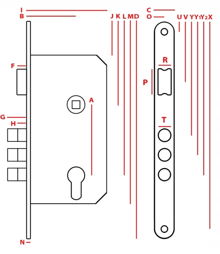 Pierwsza liczba oznacza odległość (A) od osi otworu pod klamkę, do osi otworu pod klucz, wkładkę czy WC, natomiast druga liczba odpowiada odległości (B) od czoła zamka do osi otworu pod klamkę, pod klucz, wkładkę czy WC.