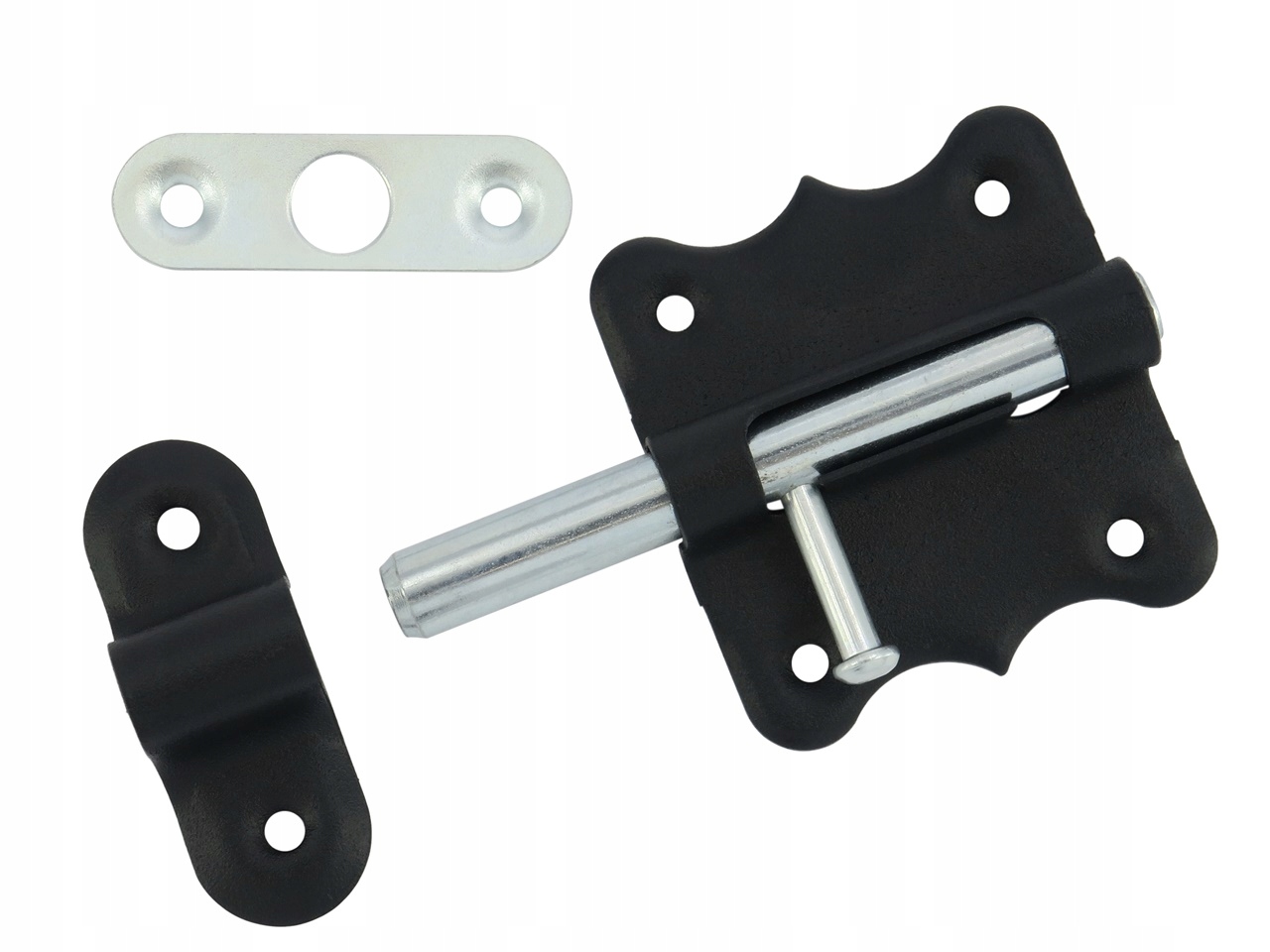 Ozdobna zasuwka o szerokim zastosowaniu. Malowana proszkowo na czarny kolor. Posiada dwa sposoby ryglowania. Pierwszy (równoległy), poprzez wsunięcie w metalową "szlufkę", drugi (prostopadły) wsunięcie w otwór w dołączonej metalowej zaślepce.