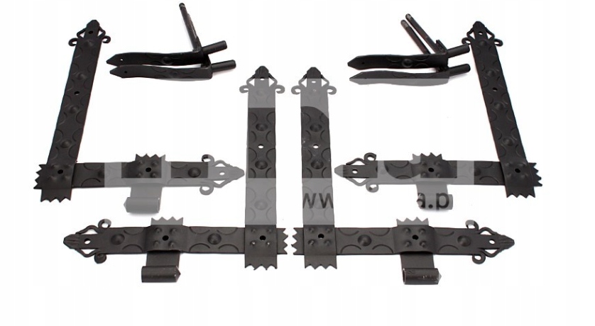 Komplet 6szt: 4 zawiasy narożne + 2 zawiasy środkowe. Komplet okuć do drzwi ramiona 60cm, typ góralski.