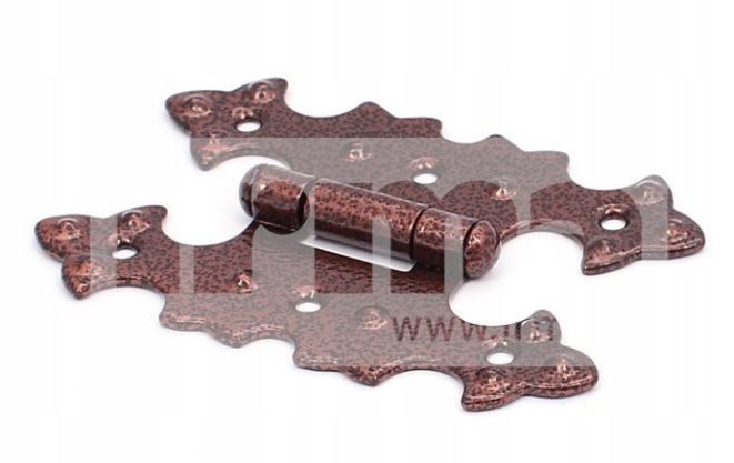 Zawias meblowy ozdobny symetryczny miedź młotkowa. Długość 78mm, szerokość po rozłożeniu 50mm