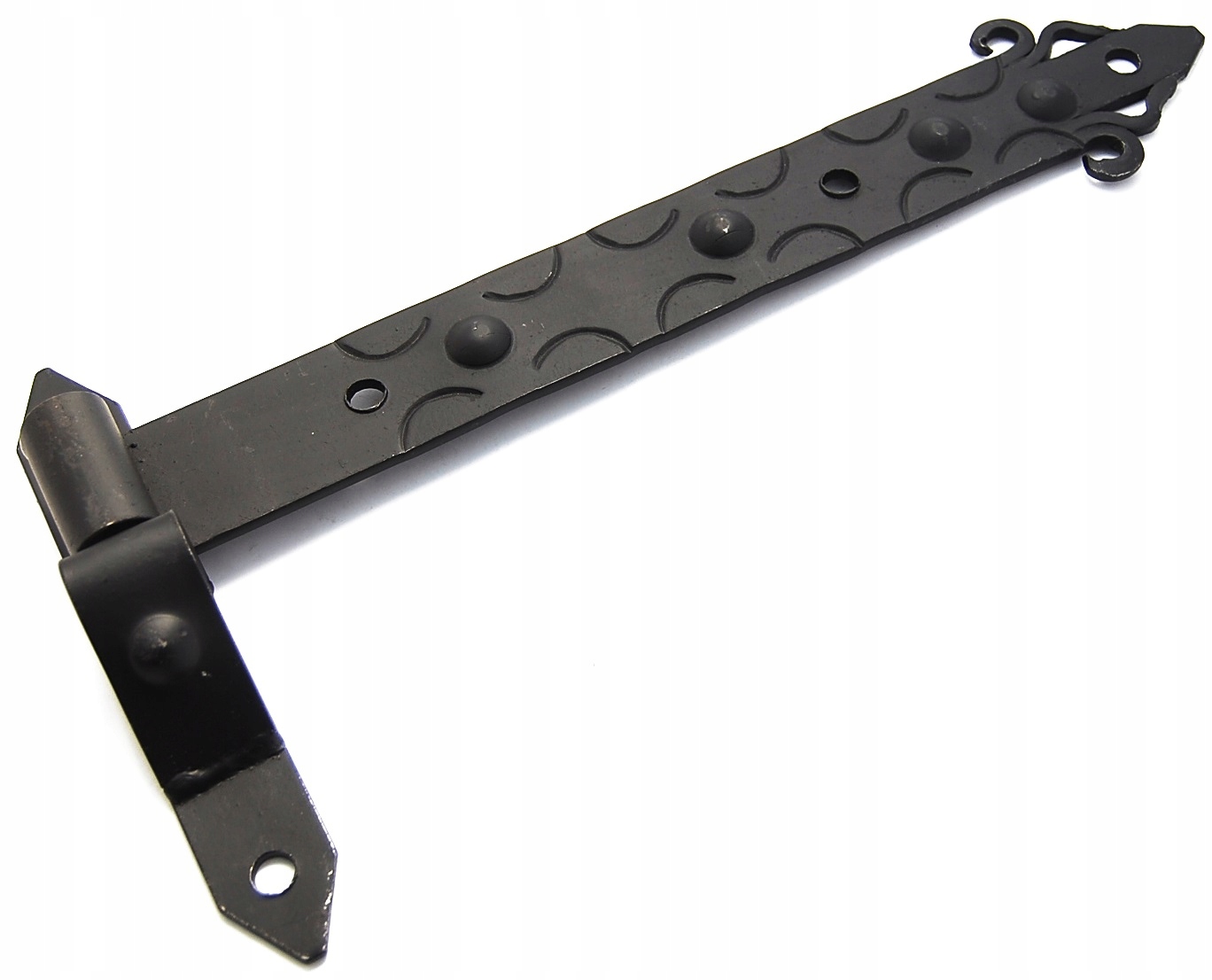 Zawias pasowy - garażowy kuty, malowane na czarno z bolcami do drewna lub betonu.