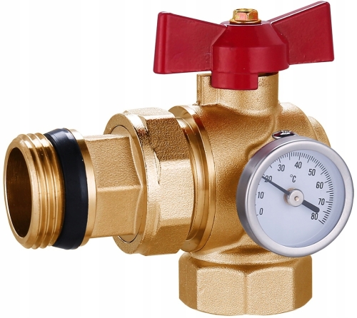 Zawór 1'' kątowy do rozdzielacza z termometrem i półśrubunkiem, czerwony