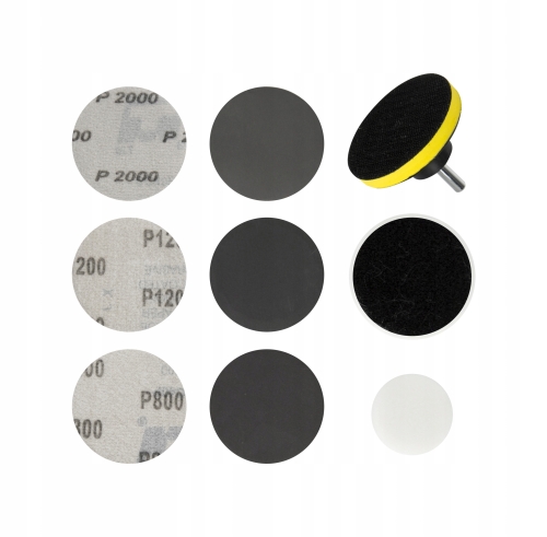 - 6x krążków ściernych mocowanych na rzep do pracy na mokro, po 2 szt z każdej granulacji: P800, P1200, P2000,