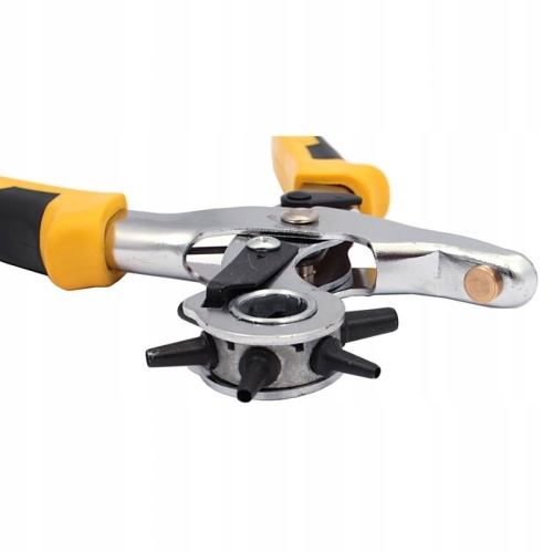 - Rewolwerowe szczypce obrotowe do dziurkowania o długości 220 mm. Przeznaczone do robienia otworów w filcu, skórze, tekstyliach, foliach z tworzywa sztucznego, tekturze itp.