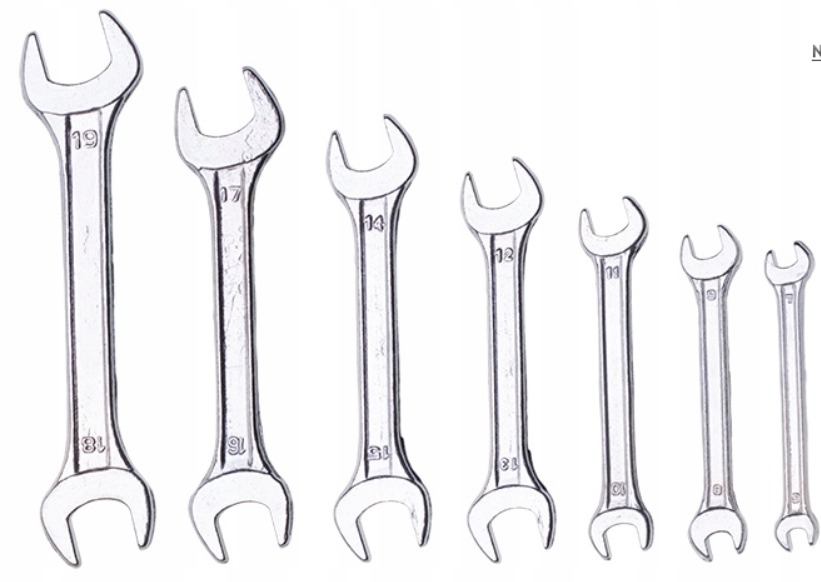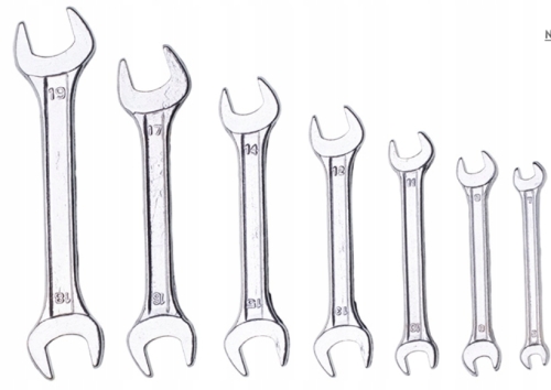 Klucze płaskie dwustronne 6-22 mm, zestaw 8 szt., rozmiary: 6 x 7, 8 x 9, 10 x 11, 12 x 13, 14 x 15, 16 x 17, 18 x 19, 20 x 22 mm