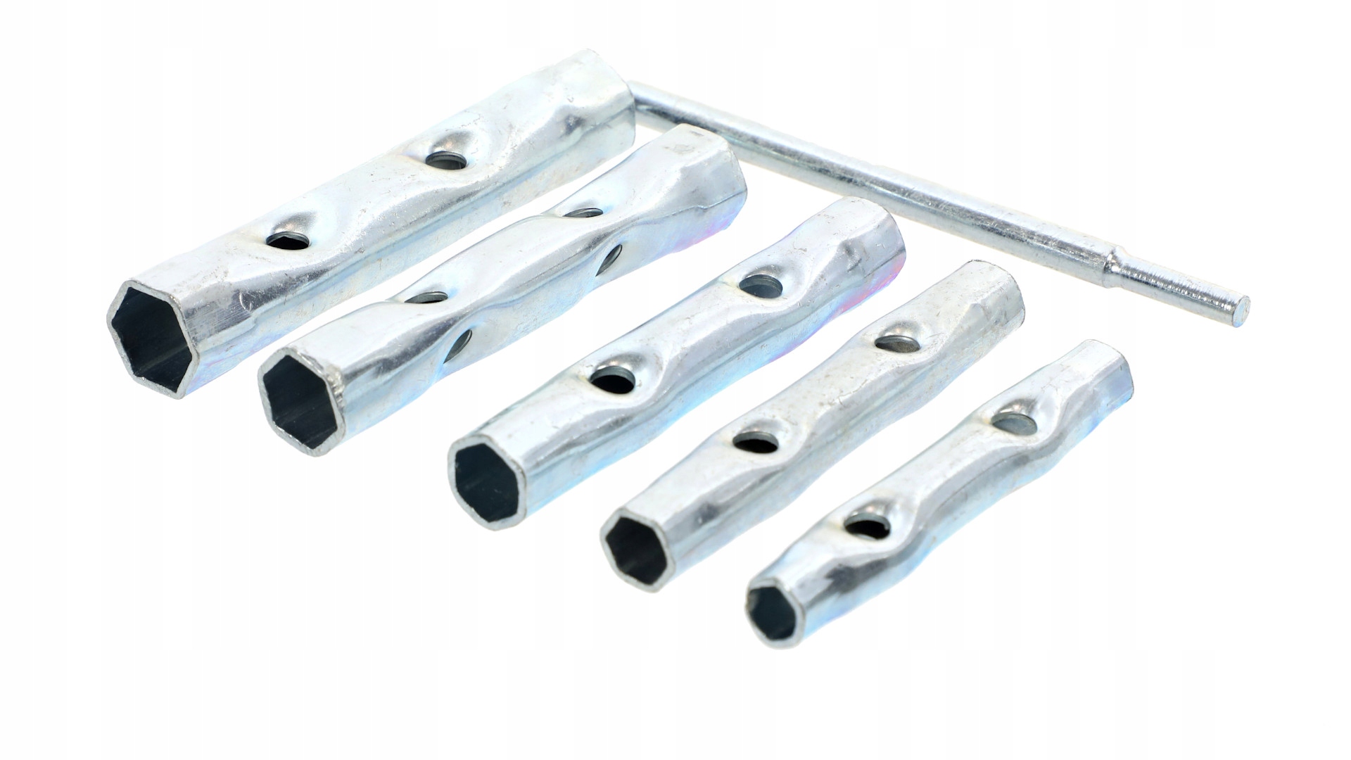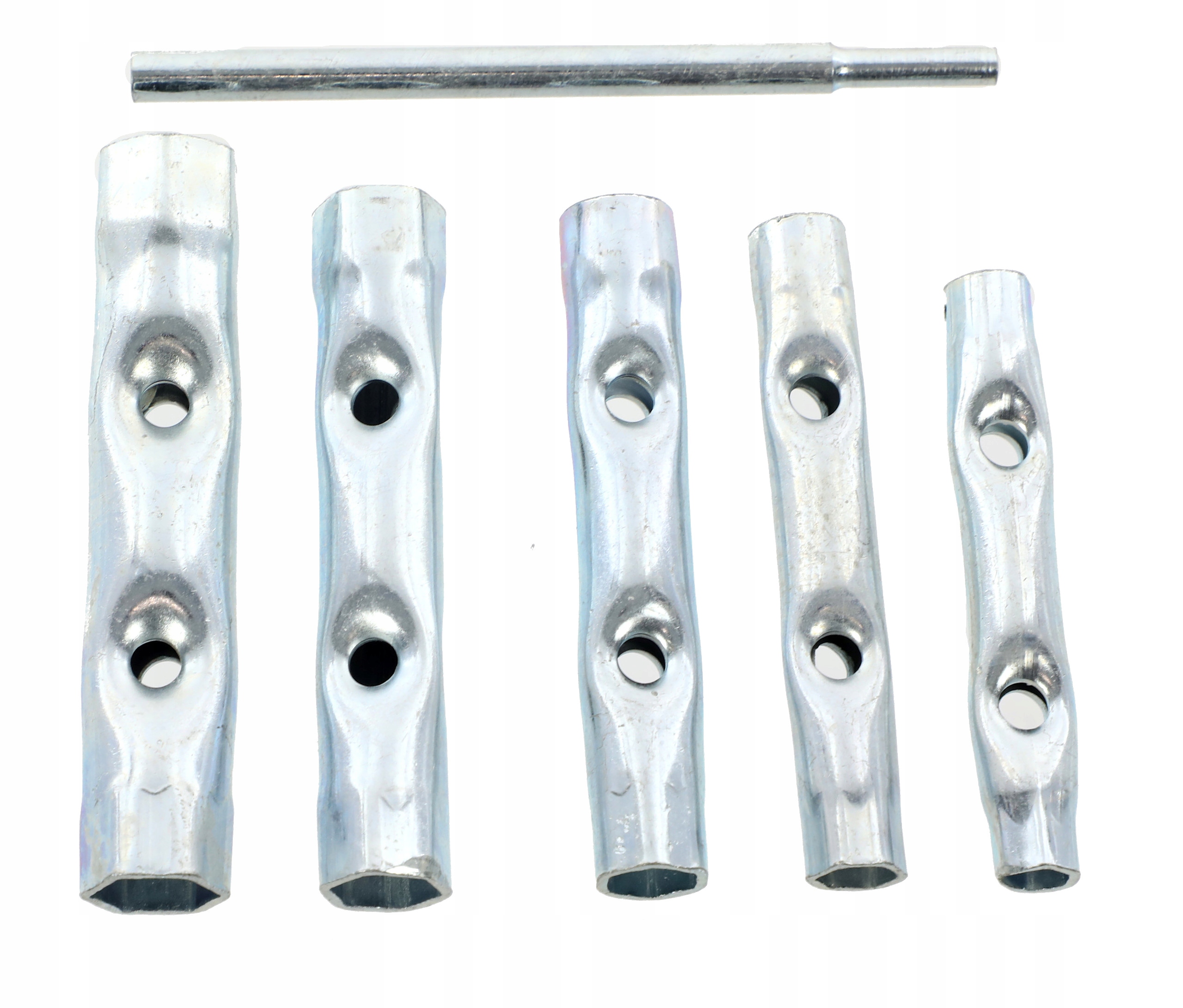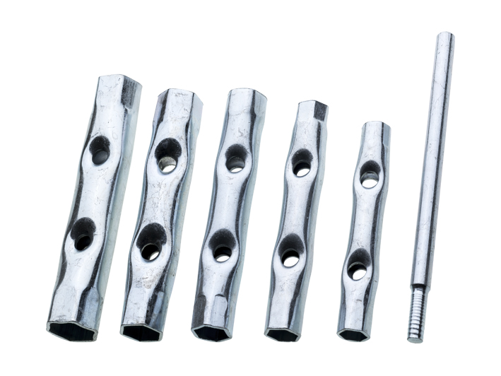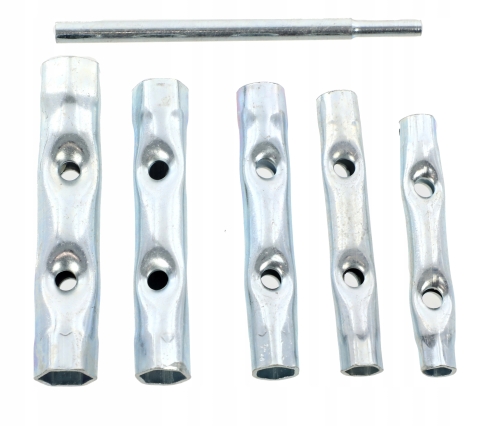 Zestaw kluczy rurowych składający się z 6 elementów ( 5 x klucze, 1 x pokrętło). Klucze zostały wykonane z wysokiej jakości stali. Służą do wykręcania świec, śrub, prac mechanicznych i naprawczych.