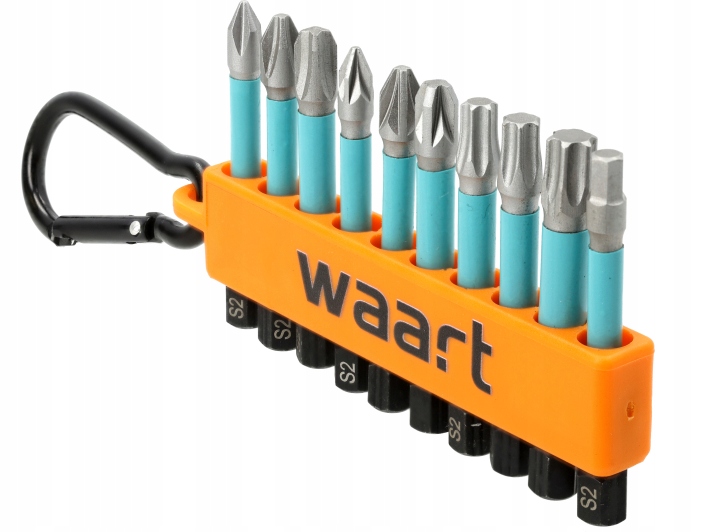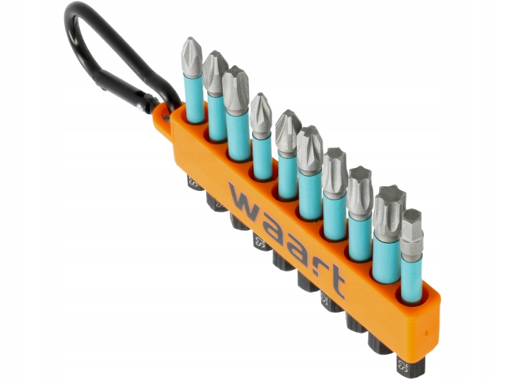 - Zestaw umieszczony jest w poręcznym, pomarańczowym uchwycie z tworzywa, wyposażonym w praktyczny karabińczyk, umożliwiający przypięcie kompletu do paska, torby lub odzieży roboczej.
