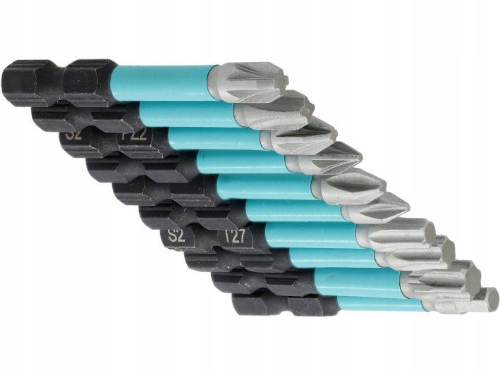 - Profesjonalny zestaw długich bitów udarowych o długości 50 mm, wykonanych z wysokiej klasy stali S2, która charakteryzuje się bardzo wysoką twardością, elastycznością oraz odpornością na przeciążenia.