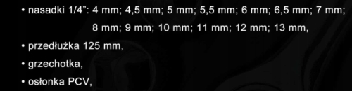 ✅ Bardzo wysoka wytrzymałość i odporność na korozję. Nasadki 1/4": 4, 4.5, 5, 5.5, 6, 6.5, 7, 8, 9, 10, 11, 12, 13 mm. Przedłużka 1/4": 50 mm. Grzechotka 1/4": 120 mm. Płytka osłaniająca 1/4".